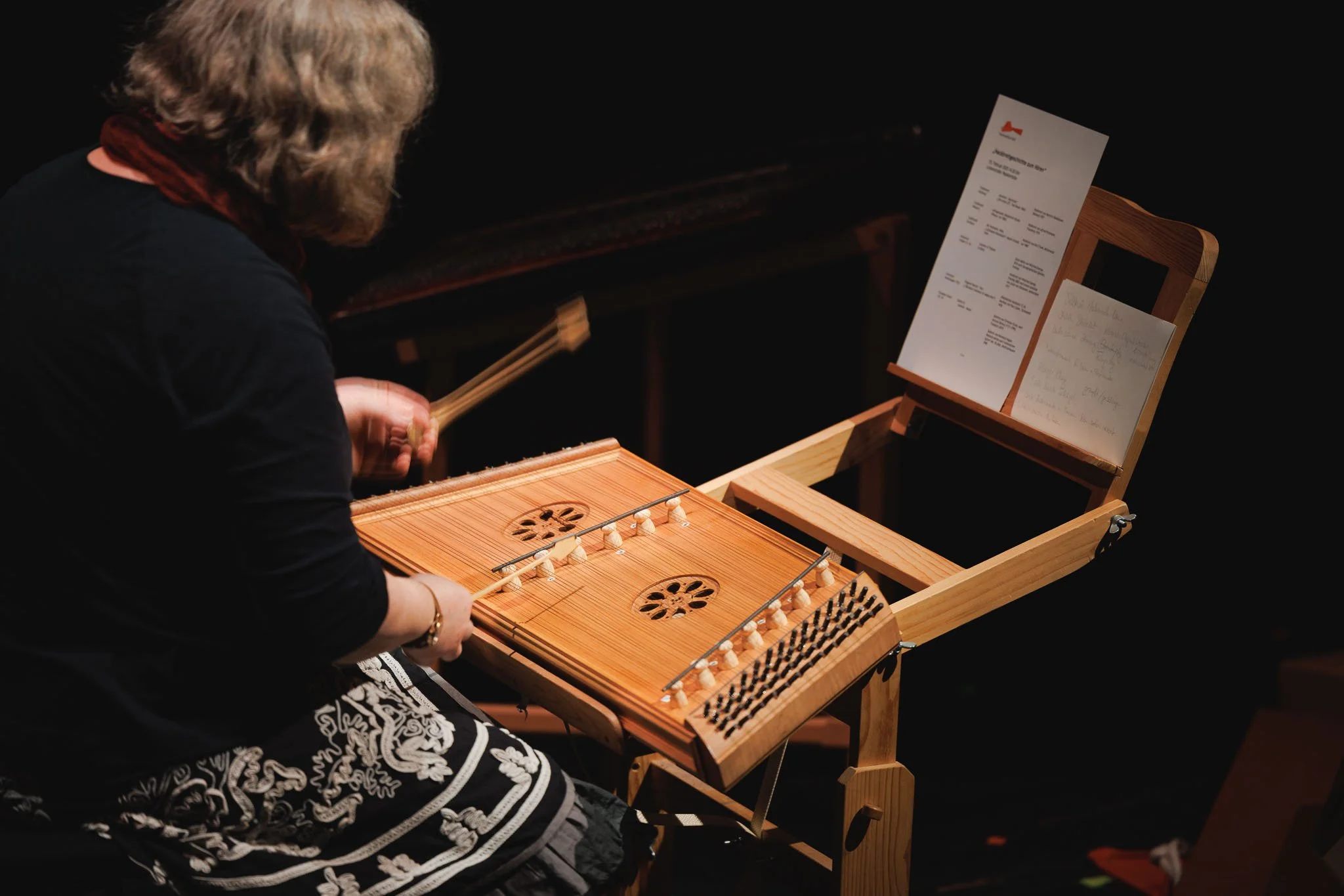Eine Materialschlacht mit zwölf verschiedenen Hackbrettern gab es im Konzert „Hackbrettgeschichte zum Hören“ zu bestaunen. Idee und Konzept kamen von Birgit Stolzenburg, die für diese Vielfalt an Hackbrettklängen sieben Instrumente aus ihrem Privatbesitz mitbrachte und selbst spielte, darunter ein Hackbrett des Pioniers Heinrich Bandzauner, eines der ersten Hackbretter von Alfred Pichlmaier von 1976, ein amerikanisches Hammered Dulcimer sowie Nachbauten zweier Mittelalterhackbretter von Winfried Goerge und ein Salterio von Reinhard Hoppe. Die Leiterin der Instrumentensammlung der Stadt Garching Belisa Mang kam mit drei Hackbrettern, darunter einem Nachbau eines diatonischen Hackbretts aus dem 17.Jh und einem klanggewaltigen Hackbrett von Karl Frank aus Mittenwald von 1969. Lisa Schöttl und Franz Anton Peter waren mit Dulce Melos und Salterio bis zum modernen Tenor und Kontrabasshackbrett dabei. Die Moderation der vier Musiker*innen erklärte die historischen Hintergründe. Bei diesem wohl einzigartigen Konzert konnte man hörbar und sichtbar erleben, aus welch reichem Schatz von Hackbrettinstrumenten die heutigen Weiterentwicklungen hervorgingen.